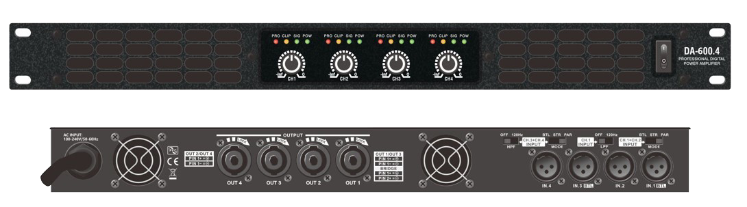 - 1U (44mm H) 4-channel power amplifier.